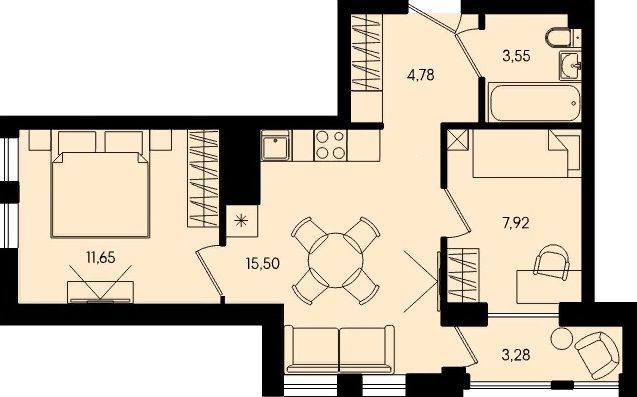 Лоджия – 3.28 кв.м, выходит из кухни.